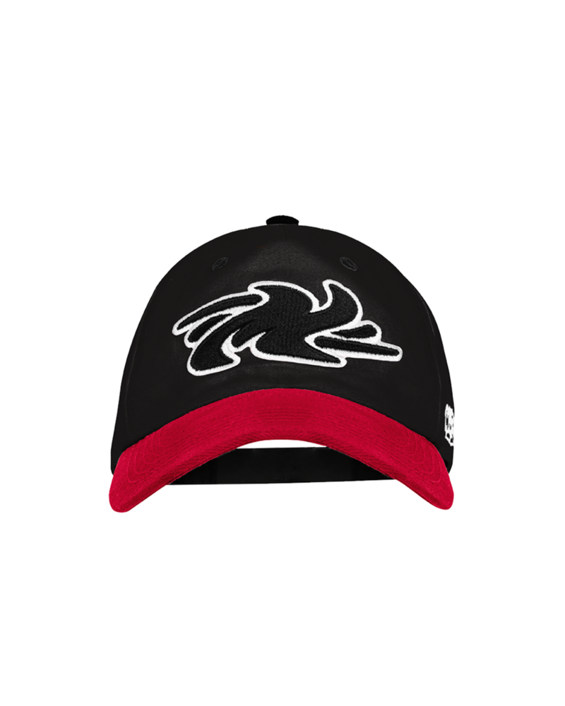 CZARNA CZAPKA Z CZERWONYM DASZKIEM. HAFTOWANE LOGO NA FRONCIE I BOKU CZAPKI. REGULOWANY PLASTIKOWY PASEK Z TYŁU. UNIWERSALNY ROZMIAR. WYPRODUKOWANE W POLSCE.