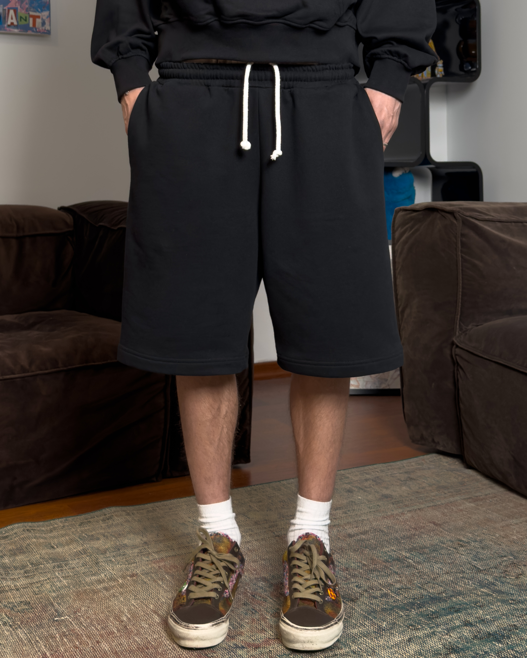 CZARNE SHORTY DRESOWE Z SZEROKĄ NOGAWKĄ ZA KOLANO.