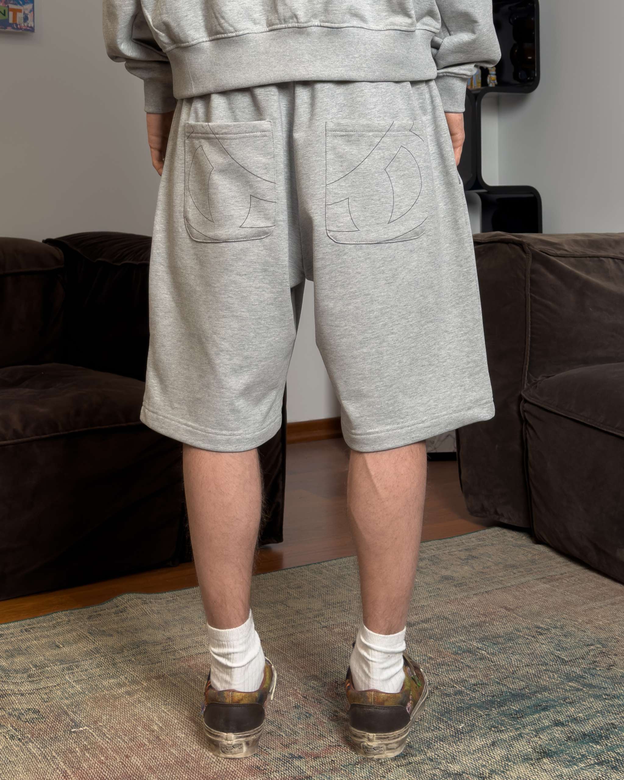 KIESZENIE TYLNIE Z NADRUKIEM FARBĄ WODNĄ ORAZ KIESZENIE BOCZNE WLOTOWE.