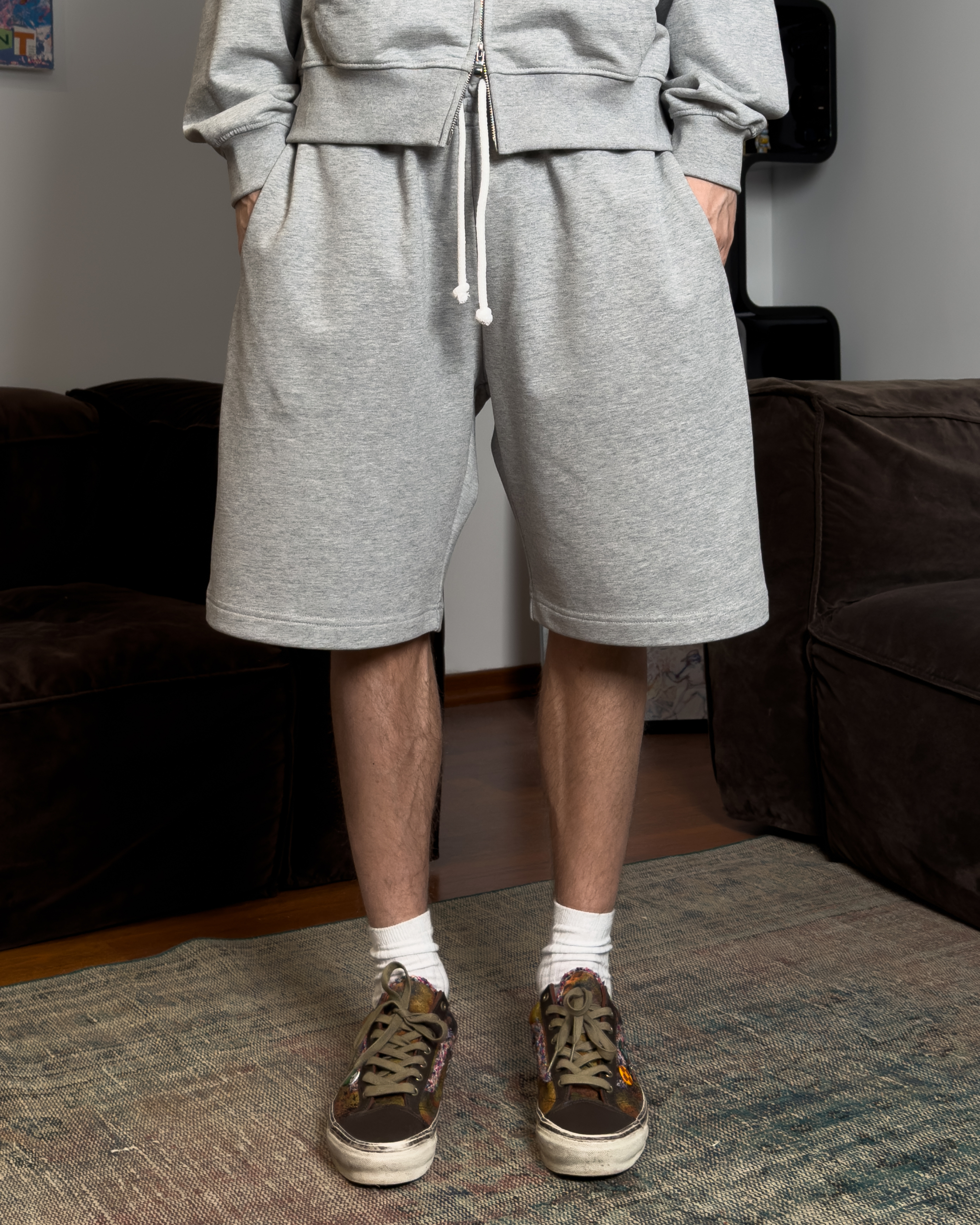 SZARE SHORTY DRESOWE Z SZEROKĄ NOGAWKĄ ZA KOLANO.