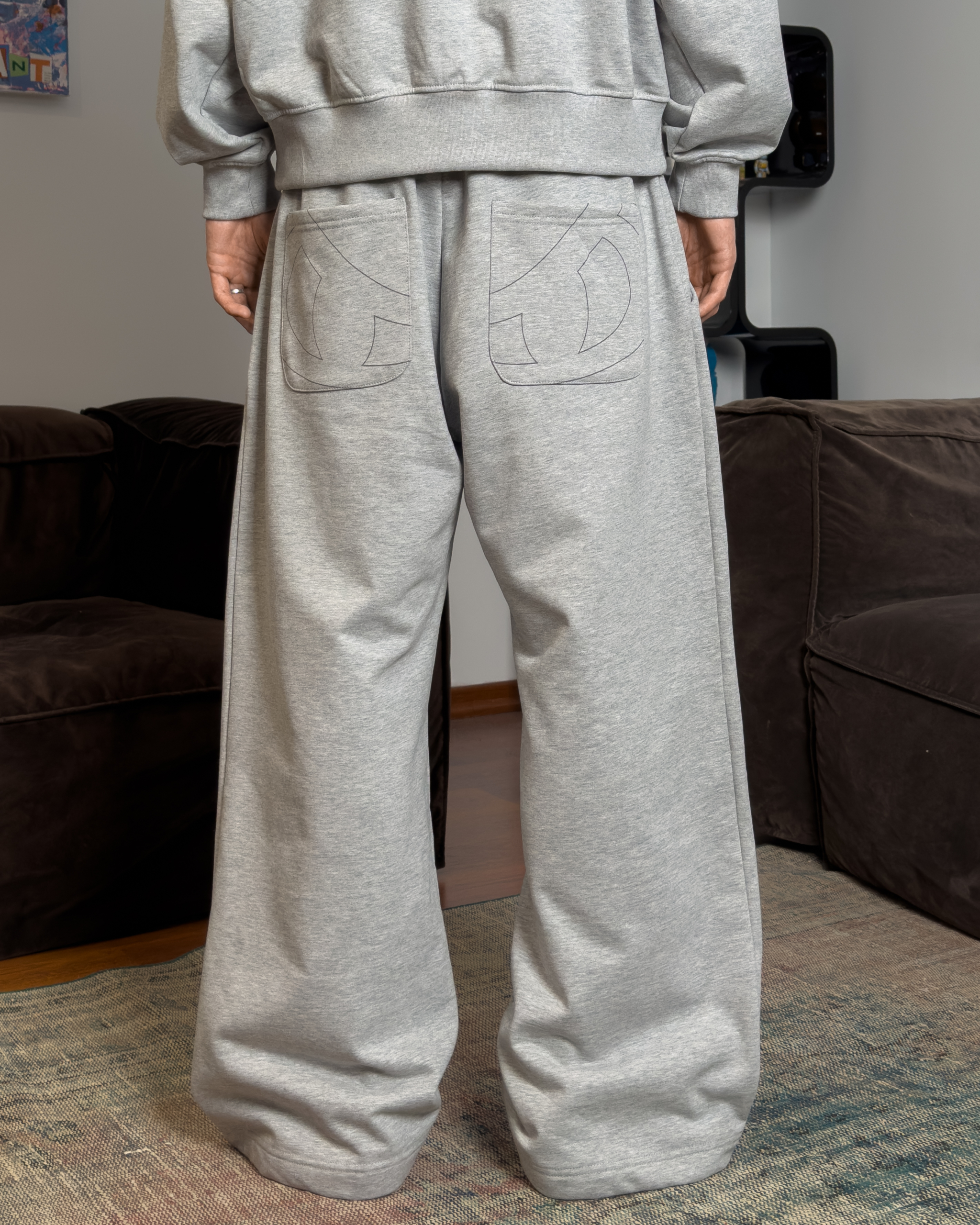 SZARE DRESY Z SZEROKĄ OTWARTĄ NOGAWKĄ.